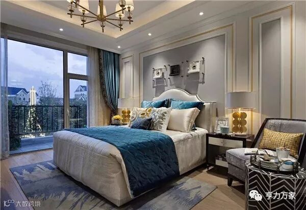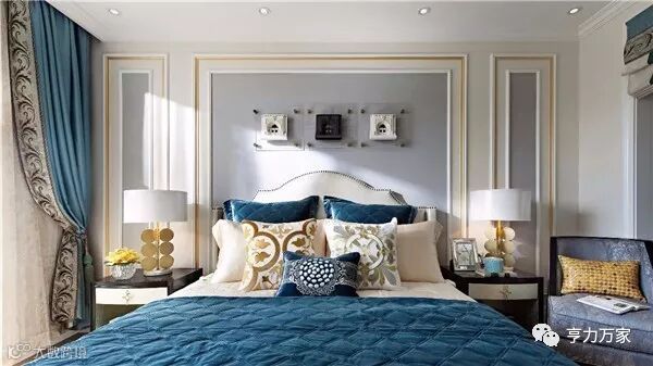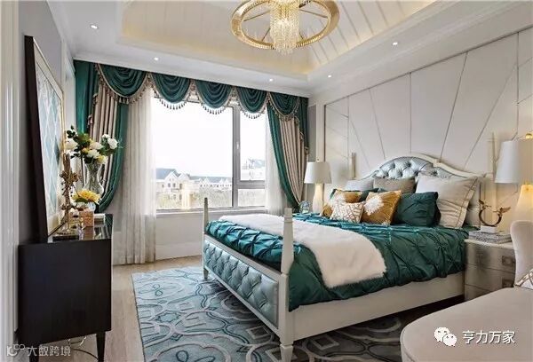 主卧延续了起居室的欧式尖顶造型,干净的床头背景不愿去破坏掉这份宁静与惬意。贝壳面的装饰边柜体现出主人的尊贵与品位,在草木绿色主色调的衬托下,花鸟元素在整个空间更是显得活灵活现。