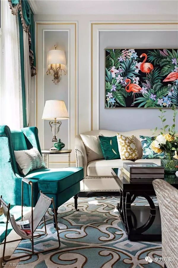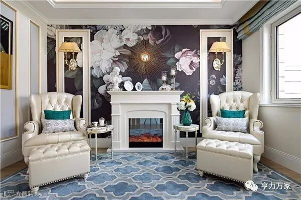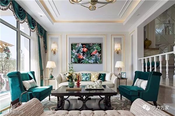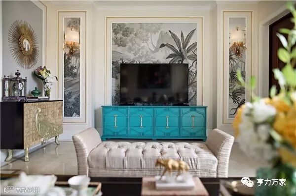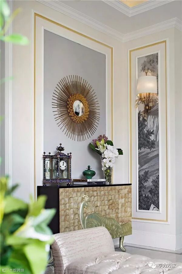 一走进客厅,硬装呈现的是标准的欧式线条设计,无论是入户门的金箔孔雀雕花图案边柜、还是边柜上彩绘铜制的古典钟表,都给人留下了深刻的印象。