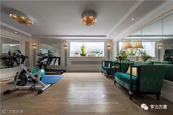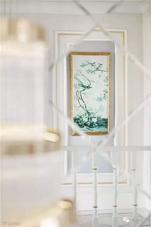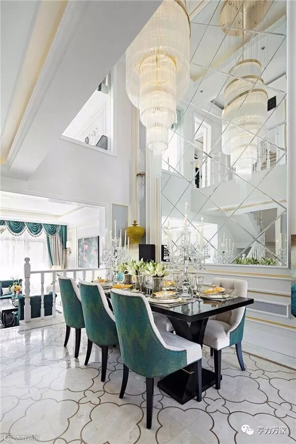 餐厅做为室内唯一的挑高层,必须承担起整个空间的大气与磅礴。一盏大型的装饰艺术灯提升了整个空间的气势,也点亮了整个空间的气质。