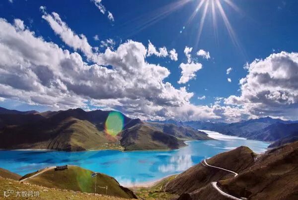耀眼的阳光和湛蓝的天空,飘扬的经幡和祈福的转经筒。