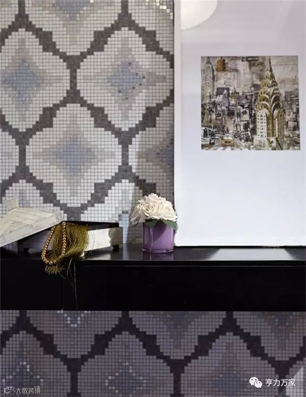 走进大门,一块后现代的窗格元素马赛克背景映入眼球,整体以灰色与白色为基调,灰白相间的瓷砖、大理石墙面为后现代风格做铺垫。