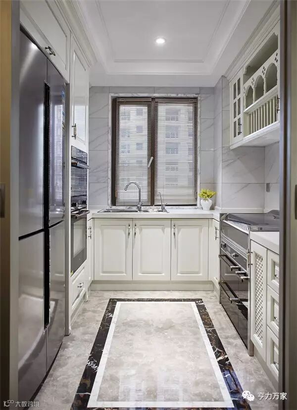 厨房以白色为主调,金属色的现代厨具配上新古典风格的橱柜设计,还有房中无处不在的黄色花卉做装饰。