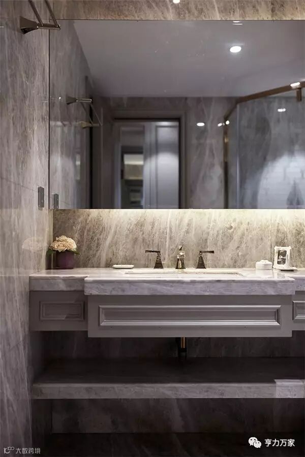 卫生间采用了大量的灰白大理石地板,墙面,桌面,扑面而来的后现代风格,加上新古典元素的抽屉设计。