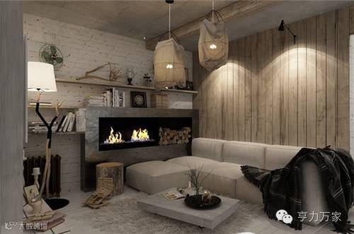 温柔深邃的空间,配以沉静温暖的大地色沙发、地毯与茶几;木质屋顶和木纹沙发背景墙的设计温暖而有亲和力;壁炉中跳跃的火苗为空间带来活泼和热烈的气息。
