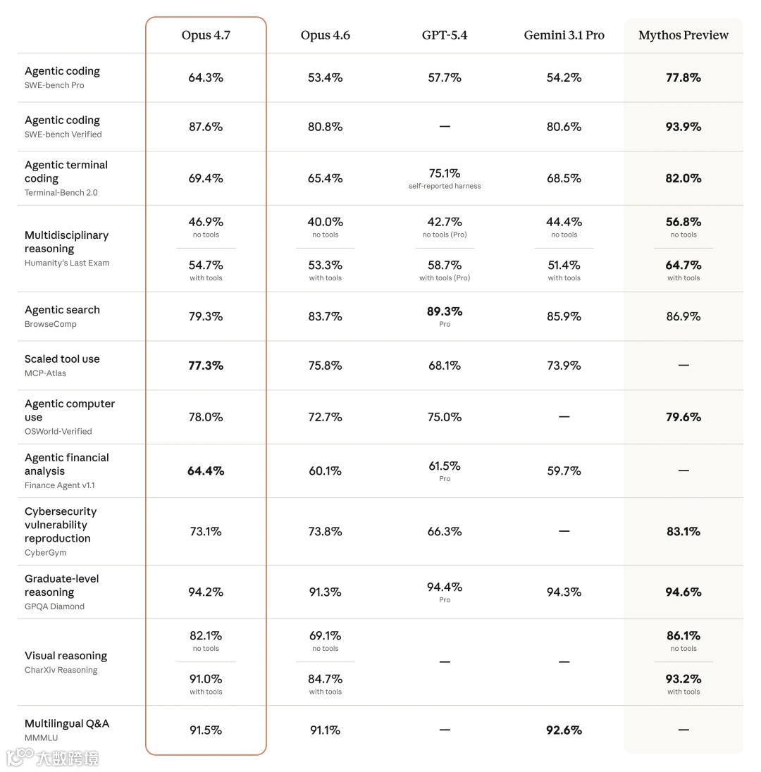 延续原有定价策略:输入5美元/百万Token,输出25美元/百万Token。推出xhigh运算级别,支持深度推理与延迟的精准调控。默认启用Claude Code高级运算模式,新增任务预算功能实现Token消耗精细化管理。底层分词器升级使输入效率提升至1.35倍,输出质量同步优化。