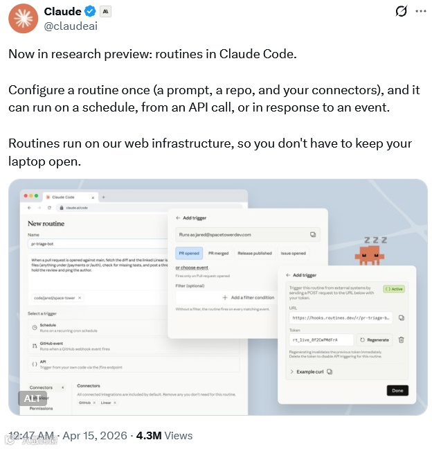 Routines功能重塑人机协作模式,通过单次提示词配置、代码仓库挂载及多API连接,实现自动化触发机制。支持定时执行、API调用及GitHub事件响应,即使在设备离线状态下,亦可自动处理代码审查等请求并生成报告。
