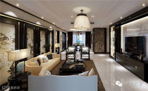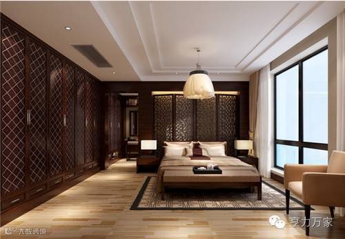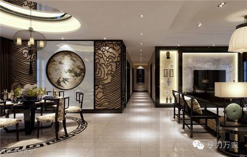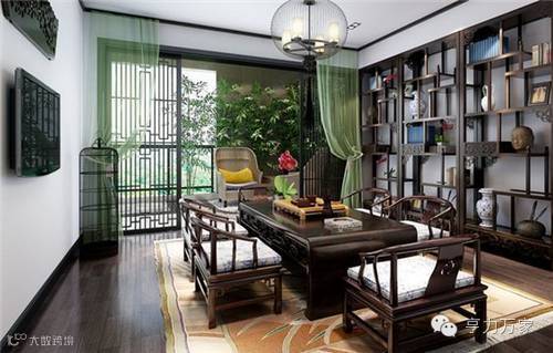 将对大自然的唯美捕捉,用优美的几何造型来呈现,营造出一种温馨和安静的气氛,中式的木结构家具,很搭屏风墙面工笔写意的花鸟画作。