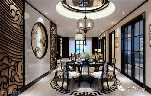 以水花波浪形状为墙饰和壁灯的外饰,装置圆窗里绘有工笔写意的山水花鸟画,灯具外形似灯笼,内里的灯管犹如四支蜡烛,圆形的餐桌椅组合寓意着中国人喜欢的团团圆圆。