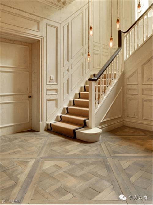 欧式的风格因为墙壁与地毯层叠的灰色而让这间房间在欧式风格中与众不同。错落悬垂的复古吊顶增加了楼梯的光线亮度。