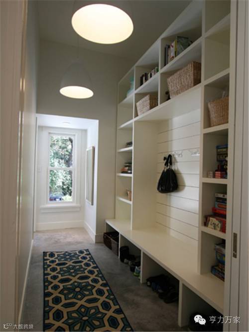 过道的阴暗狭窄因为亮色系的两个吊顶而有所改善。在复古色系的地毯上,散发光亮,让玄关不单调。