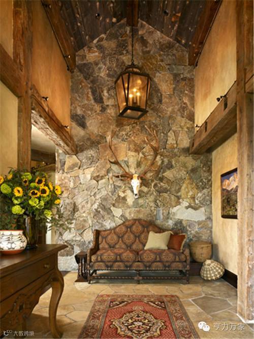 石块拼砌成的墙壁背景和陈旧的木制吊顶奠定了房间内复古的狂野基调。一款在鹿头上的古老烛光吊顶充满神秘感,犹如置身在千年古堡中。