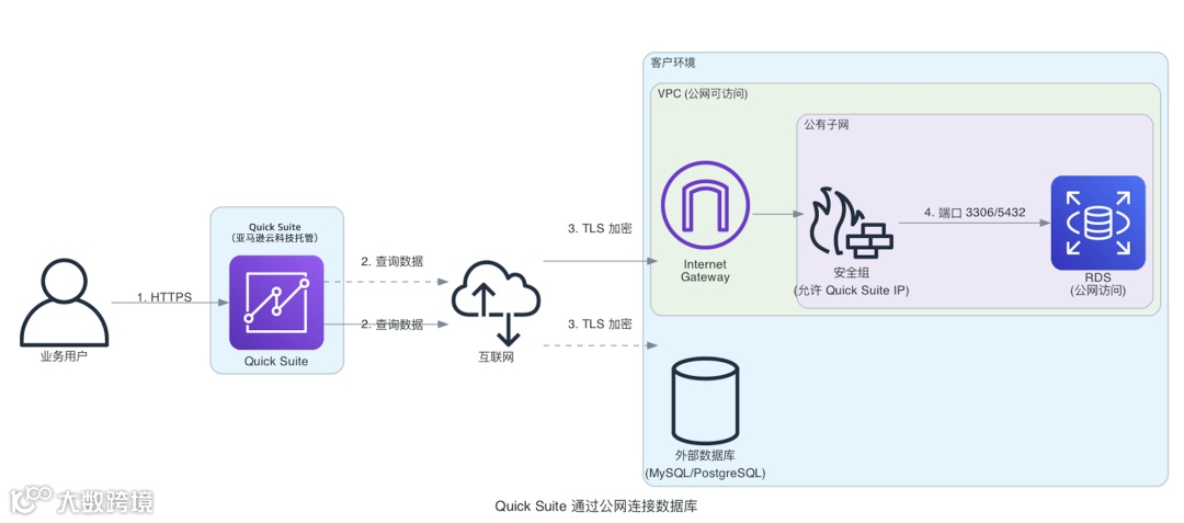 前提条件:数据库开放公网访问;安全组允许Amazon Quick Suite IP段访问;账户具读取权限。