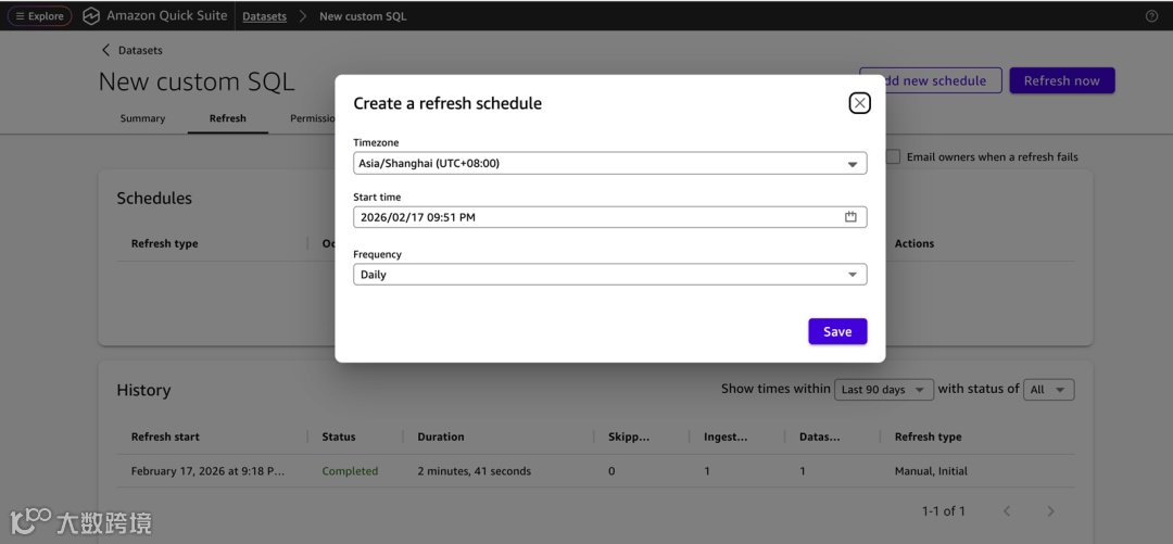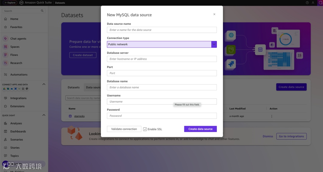 数据源连接:支持公网或VPC私网接入多种数据库(Amazon RDS、Redshift、MySQL等)及SaaS应用(Salesforce、Jira等)。