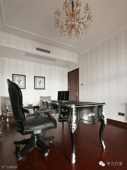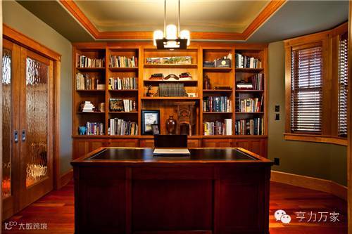 以褐色和黑色的经典搭配为主,褐色实木的书架书柜以及一把黑色的厚重皮质座椅给人一份严肃沉稳的视觉感;给整个书房增添了一份典雅气息,纯黑色的长形书桌稳重的同时又不会显的太沉闷,再加上吊灯让书房整个空间有了古典情怀。