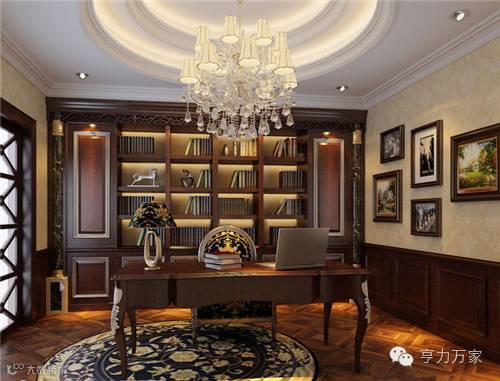 书房是人们工作学习的地方,需要安静、舒适的氛围。新古典主义的设计风格从简单到繁杂,从整体到局部,保留了传统的历史痕迹与浑厚的文化底蕴,同时又融合了现在时尚的元素。因此新古典主义风格的书房深受现代人的喜爱,在现代家居中,拥有一个“古味”十足的书房,一个可以静心阅读的空间,自然是一种更高层次的享受。