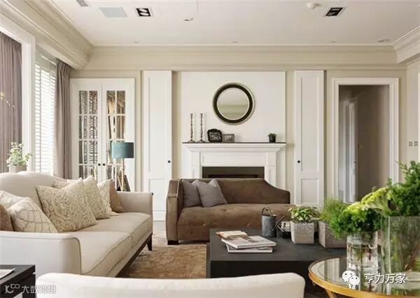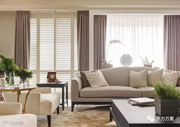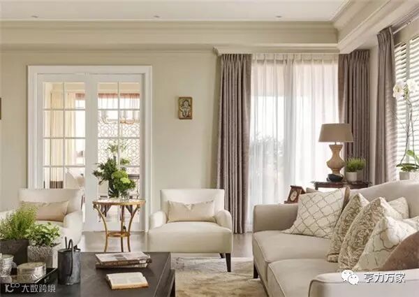 整体以米色系为主,而在与天花板的交界线,刻意让灰色再往上蔓延一段,减少天花板的白色比重,视觉自然回到家具软装上,让人感觉更为沉稳、放松。