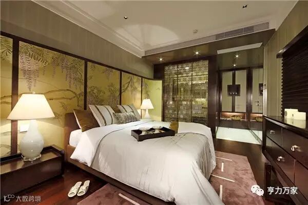 中式风格的古色古香与现代风格的简单素雅自然衔接,影视墙的造型简洁现代,却在醒目位置饰以中式装饰,这种绝妙的组合给人以强烈的视觉冲击,成为时尚与古典的柔媚结合。