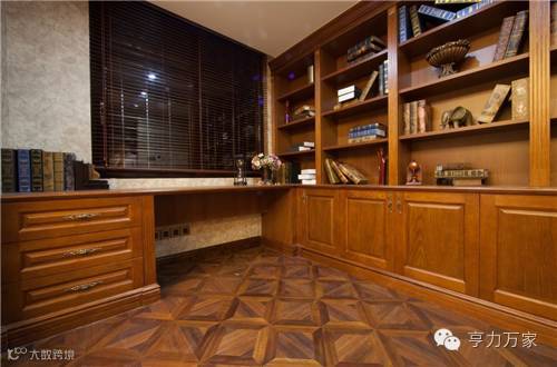 书房的地面采用了原木色的小板块木地板,而墙面则是三面用白色的乳胶漆粉刷,一面用原木色的书柜,窗户选用了黑色木框的百叶窗帘,整个空间非常的有个性。