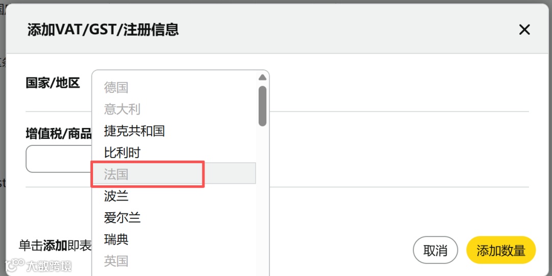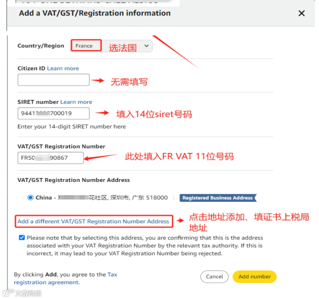 选择国家/地区为【法国】,输入VAT税号并指定税务代表地址