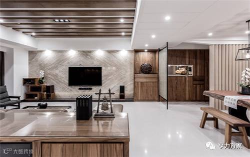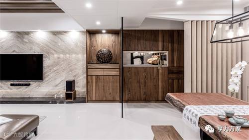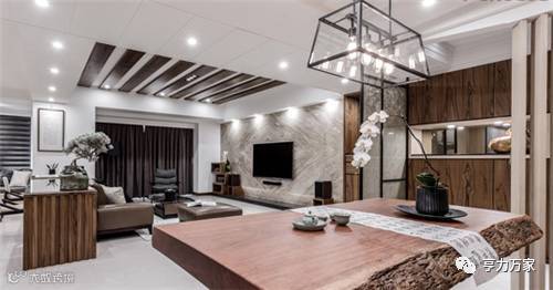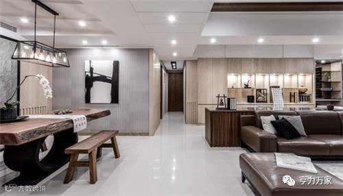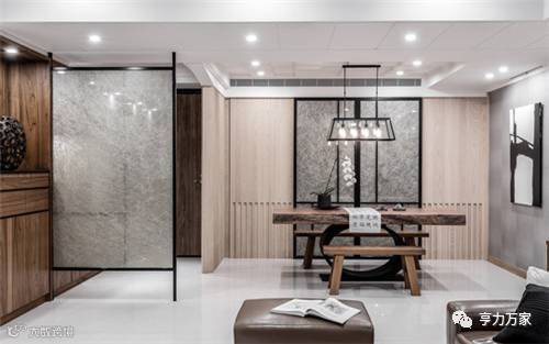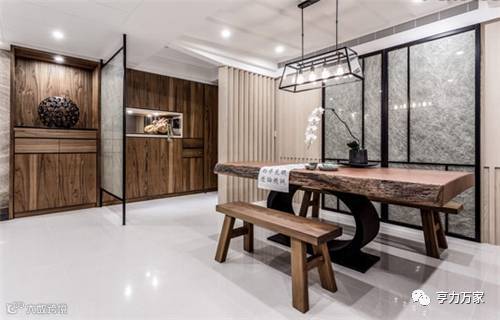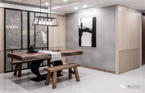 原木桌、凳摆放看似独立,实则在工业风吊灯和墙画的装饰下禅意极其浓烈,又不乏现代时尚感。极具特色的家具单品对于空间的缀饰作用,可见一斑。