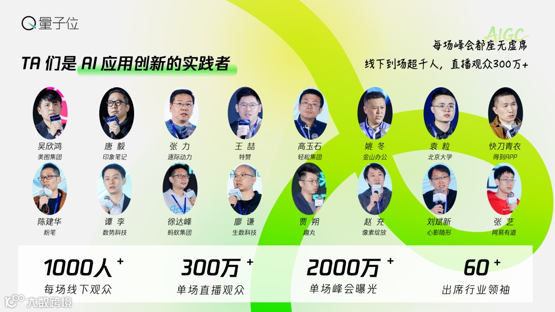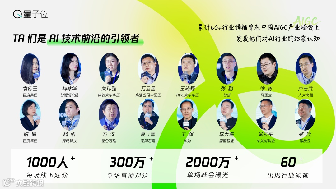 峰会连续四年聚焦生成式AI全产业链,从底层模型到落地应用。往届吸引百度、阿里通义、智源研究院、微软、高通等60+行业领袖分享前沿洞察,覆盖超1000名线下观众及350万+线上观众,全网曝光量达千万级。