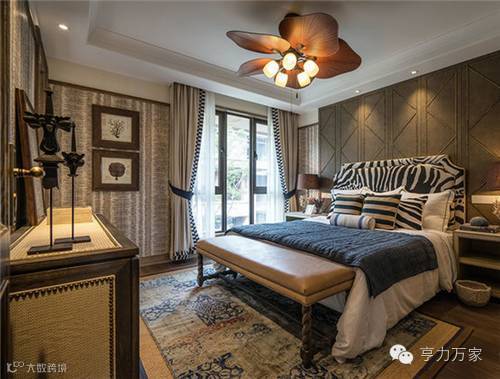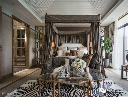 主卧在基础调性上增加了一点贵气和金属色,旧铜茶几、金色墩子提升了空间高贵气质。床品选用了香槟色的真丝面料,搭配豹纹面料及皮毛抱枕彰显出了具有野性的高贵之美。