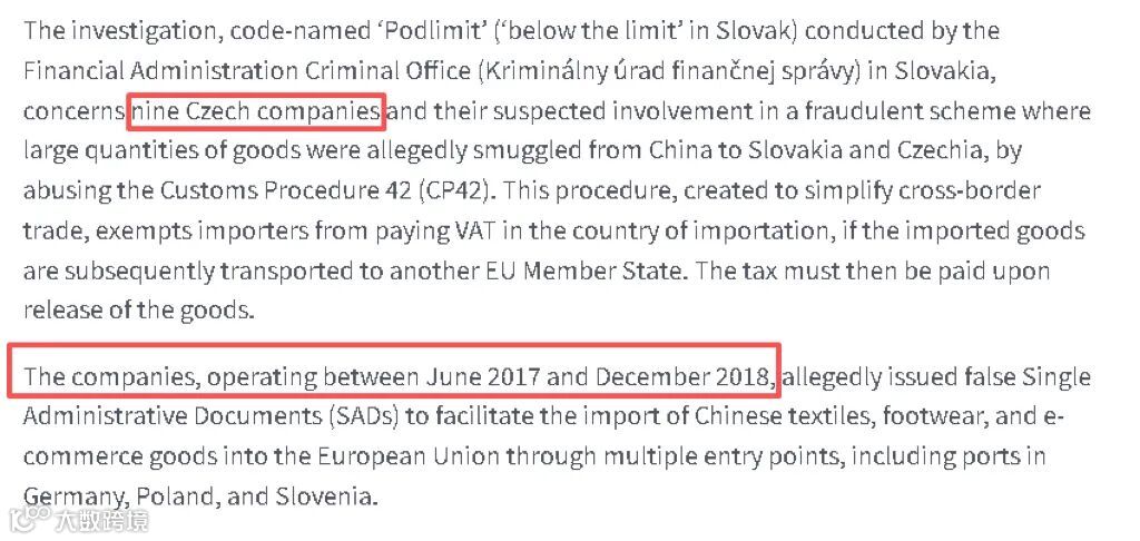 根据EPPO通报称,此次调查由斯洛伐克金融管理局刑事办公室开展,行动代号为“Podlimit”。共计涉及9家捷克公司——它们被指控涉嫌“利用海关程序42(CP42)漏洞,将大量货物从中国走私到斯洛伐克和捷克”。
