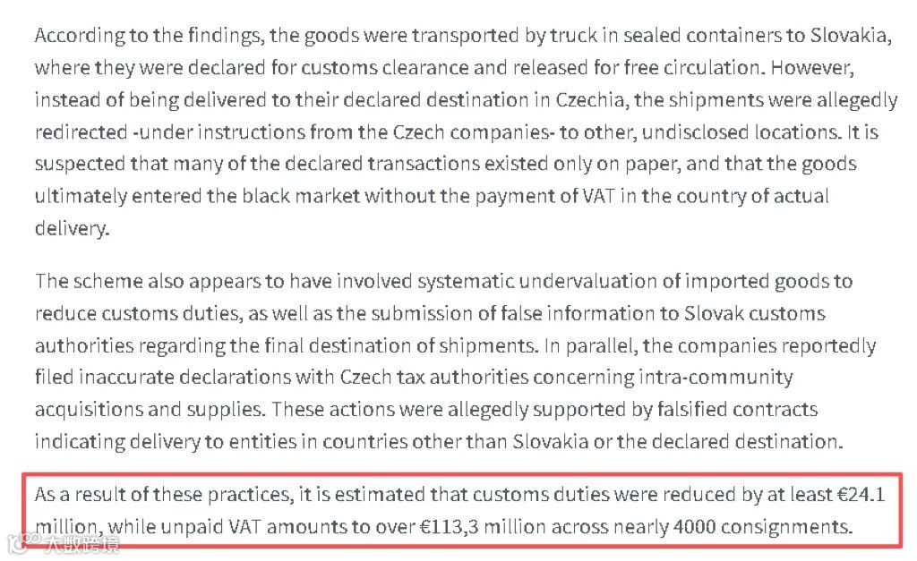 同时EPPO提到,该计划似乎还涉及系统性地低估进口货物的价值以减少关税,以及向斯洛伐克海关当局提交关于货物最终目的地的虚假信息、向捷克税务机关提交了关于欧盟内部采购和供应的不实申报。