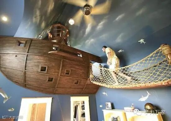 这是一位航海员的家,他非常热爱航海,在他的家里充满了海洋的元素,而他的卧室更是引进了海盗船的造型,利用墙面的垂直空间,做成了一个海盗船卧室。