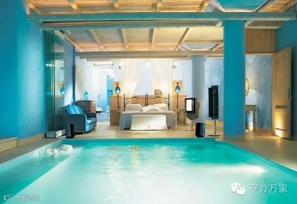 希腊的米克诺斯岛上。有这样一个蓝光大酒店,这间套房内设有一个游泳池在床脚,随时随地可以游泳,整个卧室以蓝色为主题,与泳池遥相呼应,增添清凉之感。