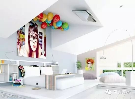 许多人睡觉的时候,视线都在天花板上,这个上海酒店的套房设计,将电视机挂在了天花板上,就算你不看电视,彩色的气球也不会让你觉得单调。