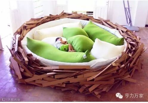 建筑师Oge设计的巢床,模仿了鸟巢的造型,特别适合小孩子居住,不仅仅可以作为他们的卧室,更是他们的游乐场。还富有深层的寓意“早起的鸟儿有虫吃!”