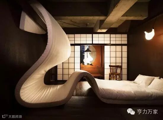 这是位于东京的爱情主题酒店,整个卧室的床垫就像盘着的蛇,侧面看起来有点恐怖,功能十分强大,新奇的造型也让人过目不忘。
