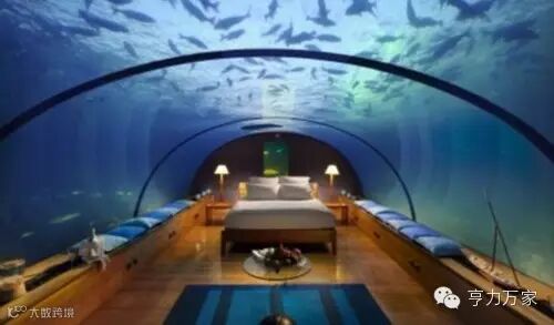 这是位于马尔代夫的Rangali度假酒店的一个海底蜜月套房,其位于海平面下约4.88米处,可180度观赏海洋生物。利用环境的优势将自然景观融入到了卧室的设计之中,让你感受梦幻般的海洋之旅。