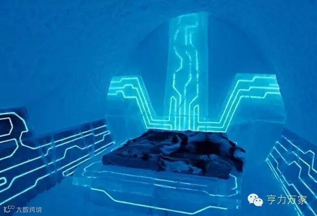瑞典一酒店的科幻电影风格套房,整个空间让你感觉似乎睡在一个电脑芯片之中,周围都是蓝光,把电源的场景模仿了过来。