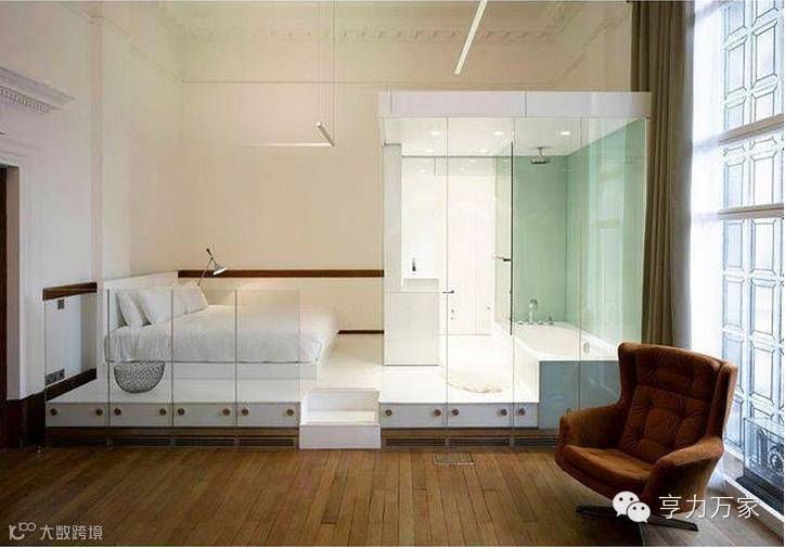 这是伦敦市政厅酒店的一个套房,它在公共区域和私人区域之间用玻璃做了一个隔断,同时又做了一个白色地板的太高设计,将床和浴室都太高,设计成了一个舞台的形式。