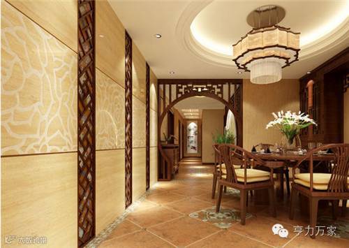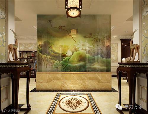 中式风格讲究天圆地方,环形顶面和地面拼花相互呼应。墙面部分使用的是瓷砖的雕刻,古朴秀美。