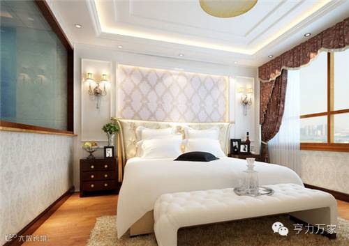 设计师围绕着这张床做出了整体空间的装饰,吊顶线条简约流畅,床头背景色彩素雅,整体空间呈现出一种简朴优美的造型。