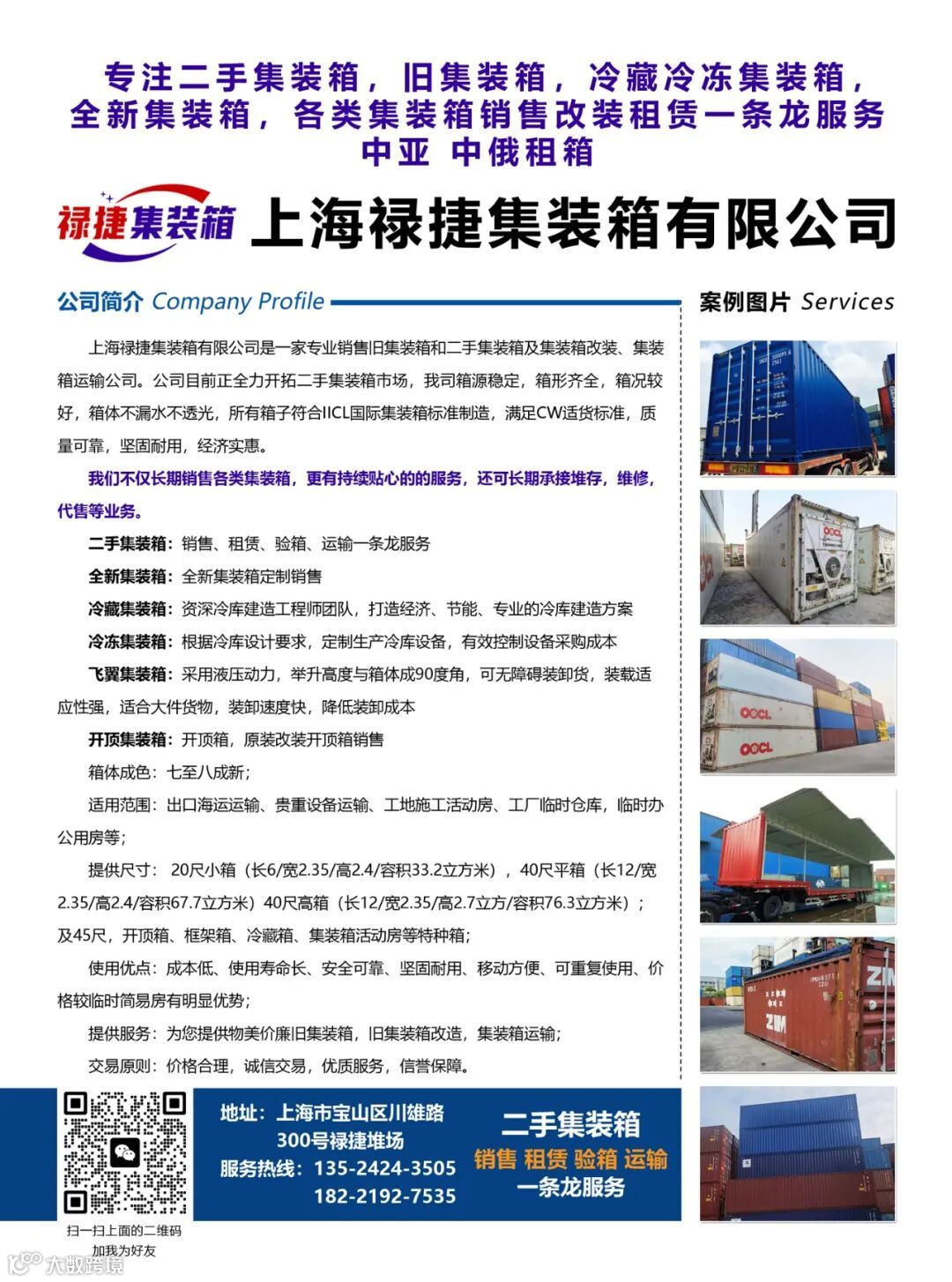 二手集装箱:销售、租赁、验箱及运输服务。