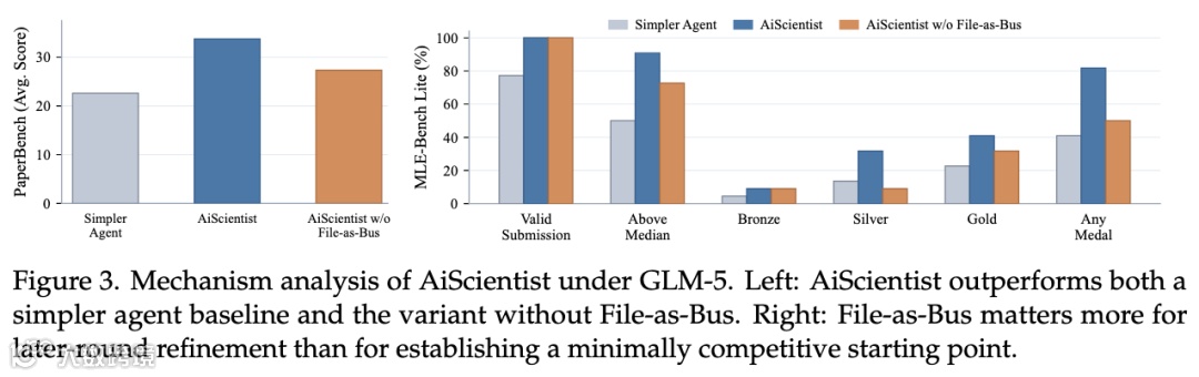消融实验证实:移除File-as-Bus机制后,PaperBench得分下降6.41分,MLE-Bench Lite Any Medal骤降31.82个百分点,证明状态连续性是长程工程核心支撑。