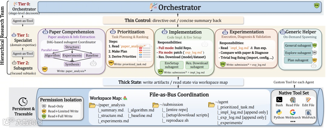 AiScientist核心理念为"薄控制覆盖厚状态"。顶层调度器(Orchestrator)负责阶段级任务推进,而项目记忆由工作空间持续演化的分析、计划与日志承担。该设计使系统避免反复重启,实现长程任务中的状态继承与渐进优化。
