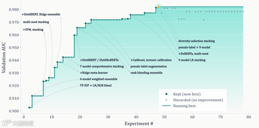 在MLE-Bench Lite的侮辱检测任务中,AiScientist在23小时内自主完成74轮实验循环,验证集AUC从0.903提升至0.982,实现18次最佳表现更新。其核心价值在于呈现完整研究工程链路:从任务解析到环境搭建、代码实现、实验分析及系统修正,形成持续迭代能力。