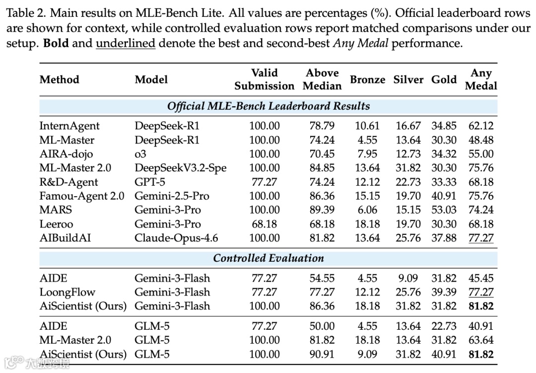 MLE-Bench Lite测试显示81.82%的Any Medal达成率,表明系统在真实研究迭代场景中持续优化能力突出。