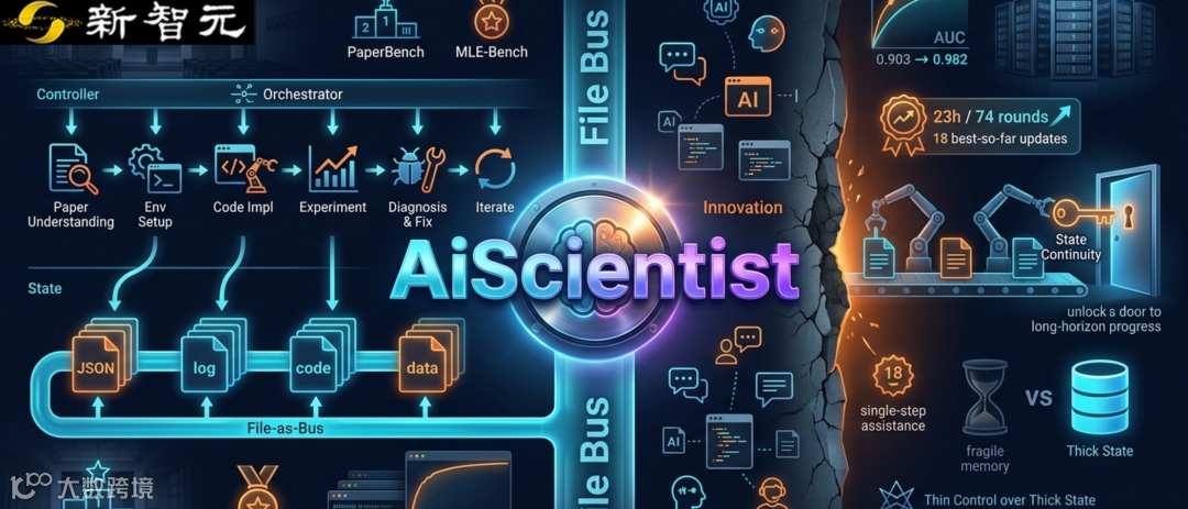 【新智元导读】中国人民大学团队研发的AiScientist系统,聚焦解决长程机器学习研究工程的持续性难题。该系统实现从论文理解到环境配置、代码实现与实验迭代的全流程贯通,其核心在于File-as-Bus机制稳定保存项目状态,使AI真正具备接手科研流程的能力。