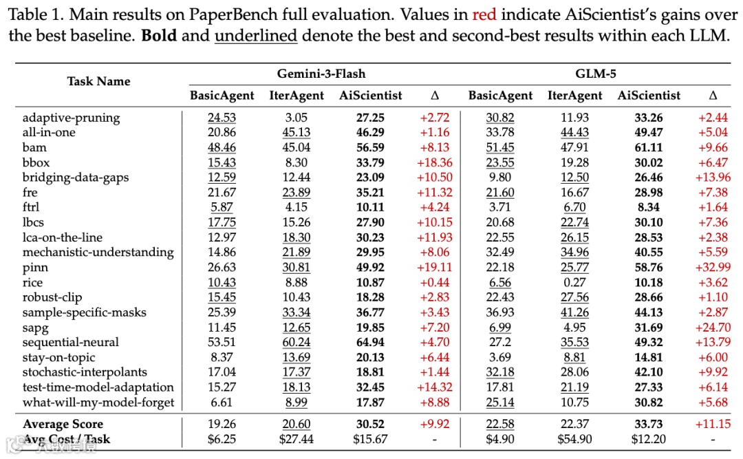 在PaperBench测试中,AiScientist平均领先基线10.54分,证明其在高难度论文复现场景具备稳定优势。