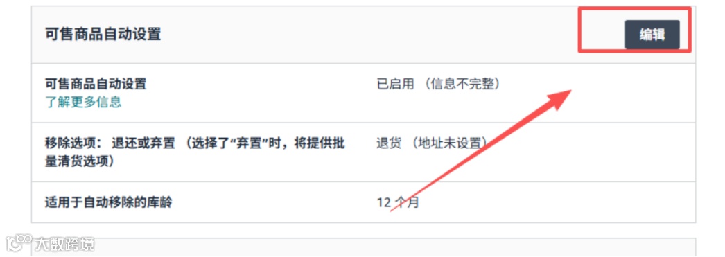 路径: 卖家中心右上角【设置】>【亚马逊物流】>【可售商品自动设置】>【编辑】