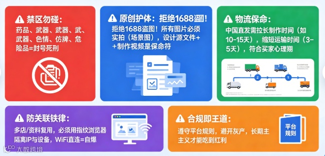- 禁区勿碰:药品、武器、色情、仿牌、危险品=封号死刑。