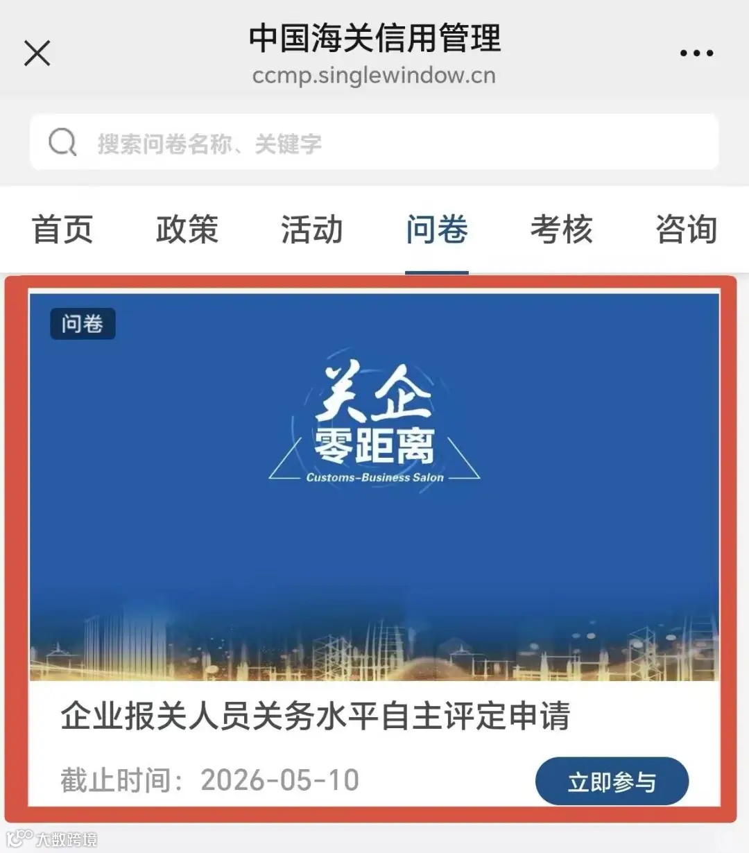 点击“问卷”——“企业报关人员关务水平自主评定申请”填写提交。