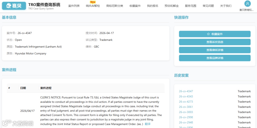 美国伊利诺伊州法院近日受理三起现代汽车商标TRO侵权案件(案号:26-cv-4347、4343、4273)。现代汽车公司及其美国分公司于2026年4月17日委托GBC律师事务所,对涉嫌销售侵权汽车零部件及配件的跨境电商平台卖家提起诉讼,涉诉商标包括HYUNDAI及Tucson、Elantra、Santa Fe等系列注册商标。