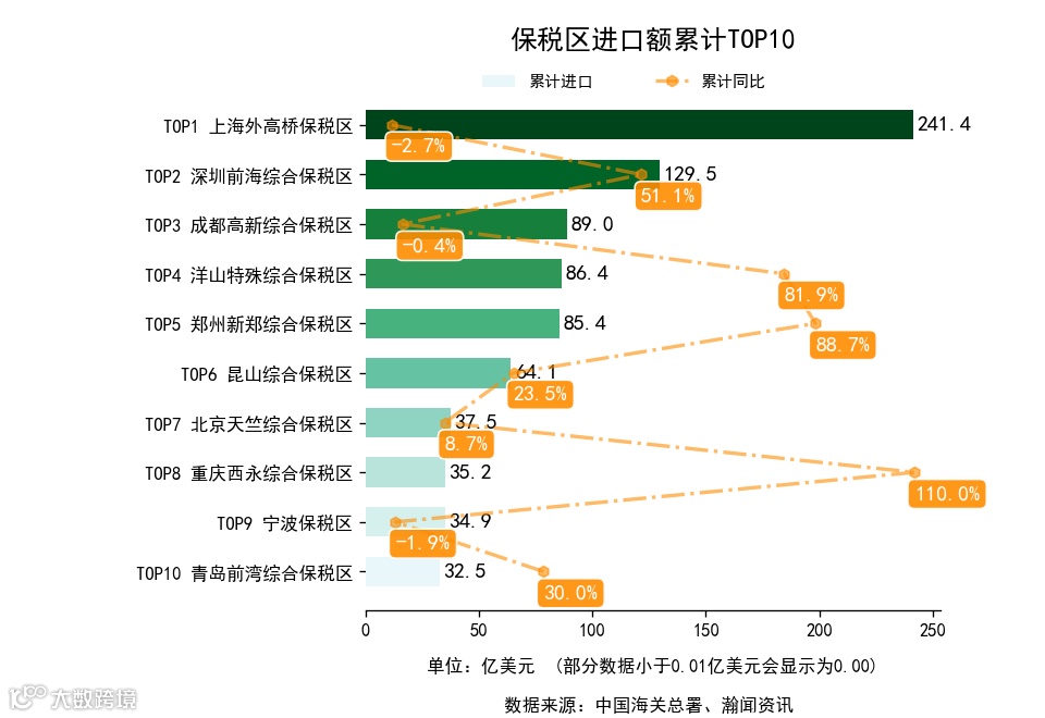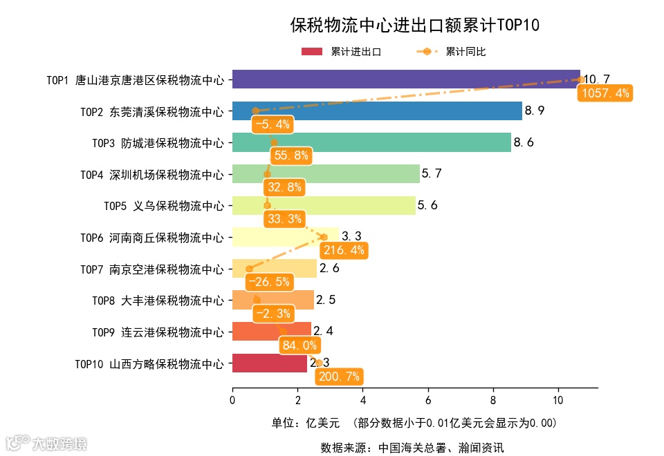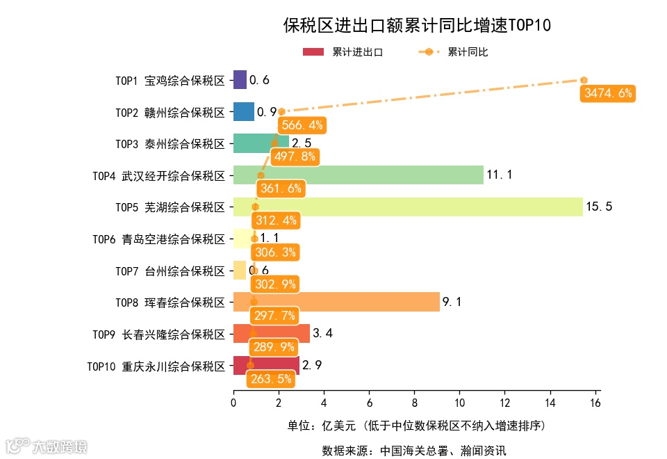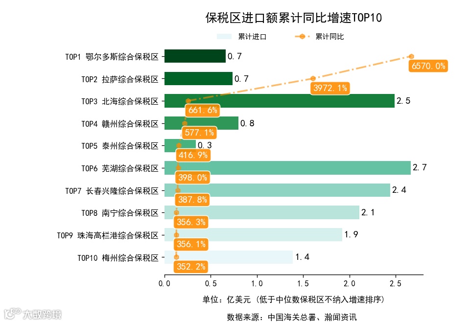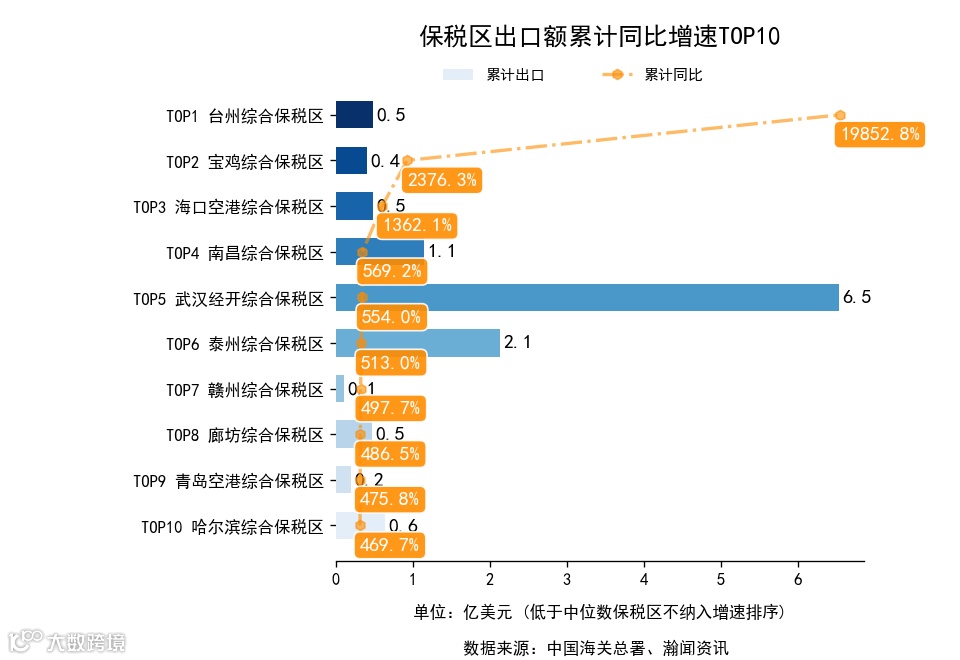 前3月,全国155个保税区中,累计出口额同比增长的有99个,下降的有56个。增长最高是台州综合保税区,出口0.5亿美元,累计同比19852.8%。累计进口额同比增长的有95个,下降的有60个。增长最高是鄂尔多斯综合保税区,进口0.7亿美元,累计同比6570.0%.